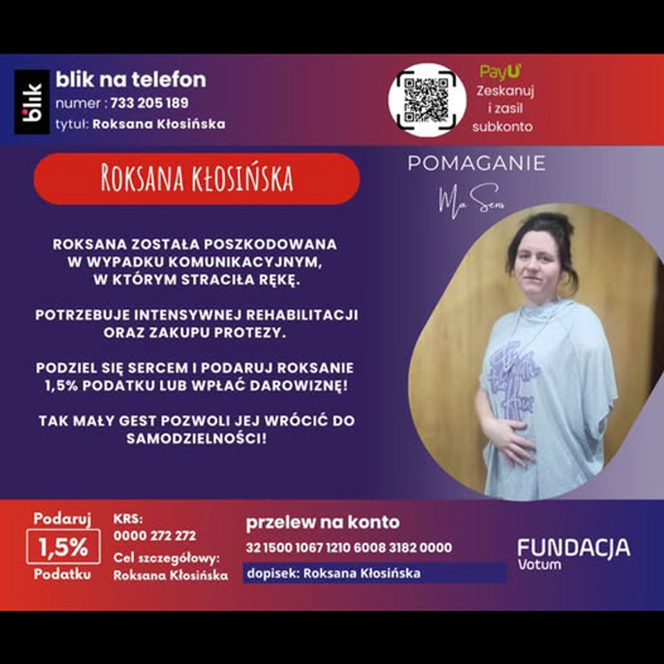 Możesz pomóc, wpłacając pieniądze na konto Fundacji Votum lub oddając 1,5% podatku. Numer konta 32 1500 1067 1210 6008 3182 0000. Dopisek Roksana Kłosińska. Dodatkowe informacje na stronie Fundacji Votum.