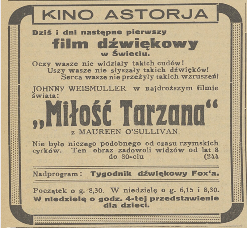 Tutejsza komisja kontrolująca filmy a składająca się przeważnie z starszych pań zakwestionowała film ‘’wolna miłość’’. Na tej podstawie rozkazał tutejszy burmistrz przodownikowi tutejszej policji państw, zamknięcie kinematografu. Z jakich powodów nie wiadomo, gdyż jak załączony telegram opiewa, film powyższy przedstawiono w Toruniu, Bydgoszczy, Grudziądzu, Tczewie i Starogardzie, z tego wynika, że niebył to film niemoralny, lecz pod każdym względem bez zarzutu. Na wniosek dyrekcji kinematografu osobna komisja zkładająca się z przedstawiciela Starostwa i kilku obywateli miasta beznaganność filmu tylko potwierdziła.