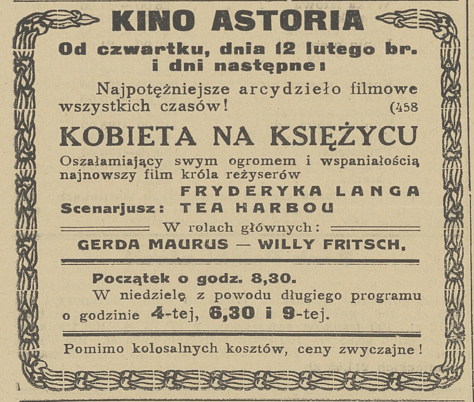 W sierpniu 1929 r. korespondowałem z firmą „PAT” Warszawa, Krakowskie Przedmieście 50 –o dostawę pow. kronik filmowych. Niemożliwe mi jednak było wyświetlać owe filmy, ponieważ firma żądała za wysoką cenę za pow. filmy, za wysoką w stosunku do mego małego kinoteatru /148 miejsc/ w małem mieście, i które czynne jest tylko 3-4 dni w tygodniu. Cena najmu miała wynosić 150% więcej jak u innych firm za podobne tygodniki jak naprzykład u firmy „GAUMONT” Paryż, filia w Warszawie.