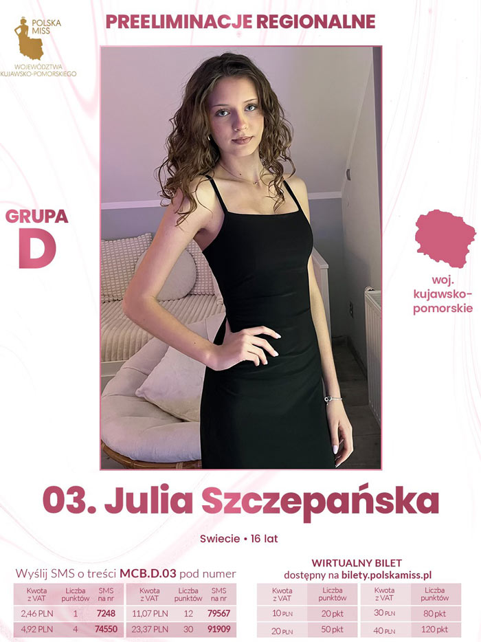 Organizatorzy nie zwalniajฤ tempa. Obecnie trwajฤ preeliminacje w grupie D, czyli w kategorii Polska Miss Nastolatek Wojewรณdztwa Kujawsko-Pomorskiego dla dziewczฤ t z rocznikรณw 2008โ2012. Gลosowanie potrwa do 10 lutego, a wลrรณd kandydatek znalazลa siฤ m.in. 16-letnia Julia Szczepaลska ze ลwiecia.