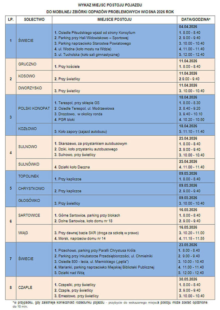 Do mobilnego punktu przyjmowane będą wyłącznie odpady komunalne od gospodarstw domowych z terenu gminy Świecie i dostarczone w sposób posegregowany.