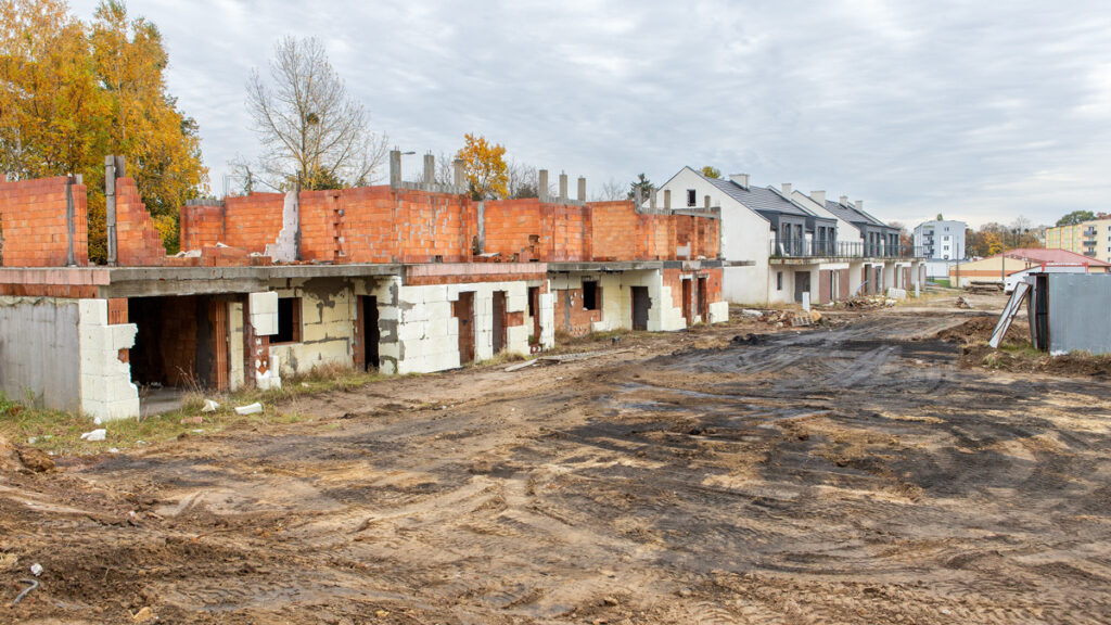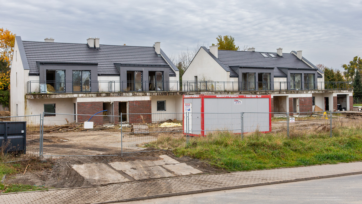 W budynku, który zaczęto wznosić jako pierwszy, prace były najbardziej zaawansowane. Wstawiono nawet okna i bramy garażowe. Od frontu zbudowano parking z kostki brukowej.