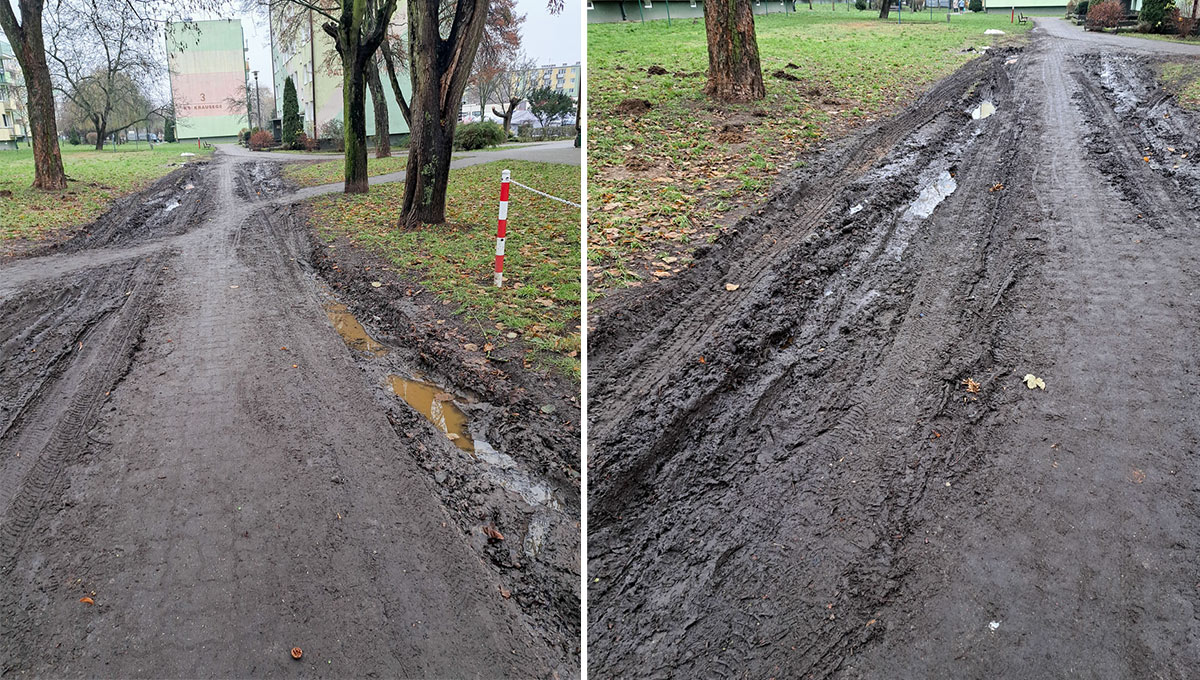 Jak mówią mieszkańcy, pojazdy wjeżdżające na drogę dojazdową do bloków przy ul. Paderewskiego powodują, że błoto trafia również na pobliski chodnik, który jest jedyną drogą dojścia. Niektórzy jeżdżą nawet po chodniku.