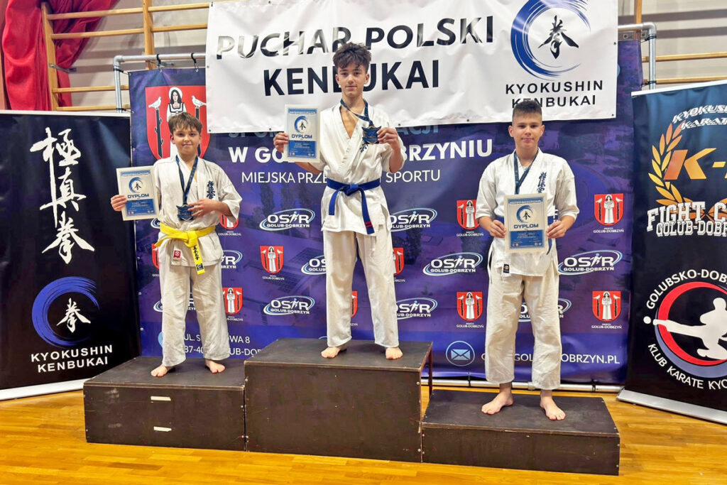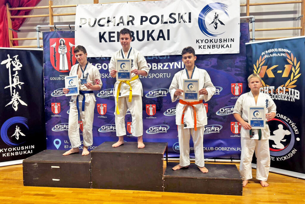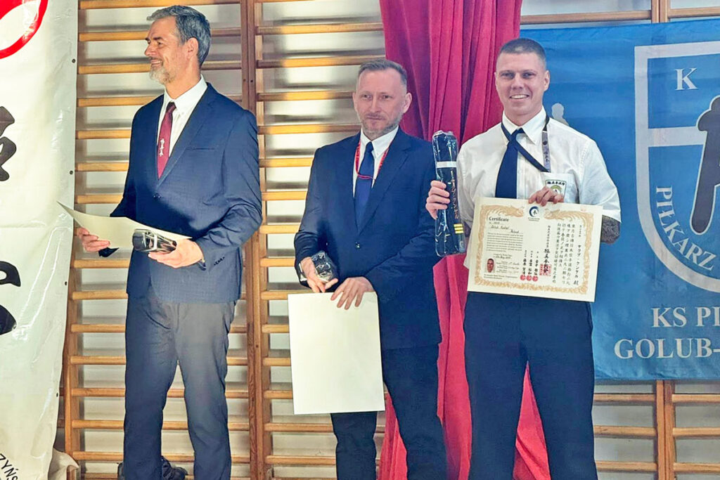 Na niedzielnych zawodach w Golubiu-Dobrzyniu odbyła się również uroczysta ceremonia wręczenia japońskich czarnych pasów oraz certyfikatów dla osób, które pozytywnie zdały egzamin na stopnie mistrzowskie podczas tegorocznego Letniego Obozu Kyokushin Kenbukai PFKK w Tucholi. Jakub Kunkel odebrał certyfikat i pas 3 dan.