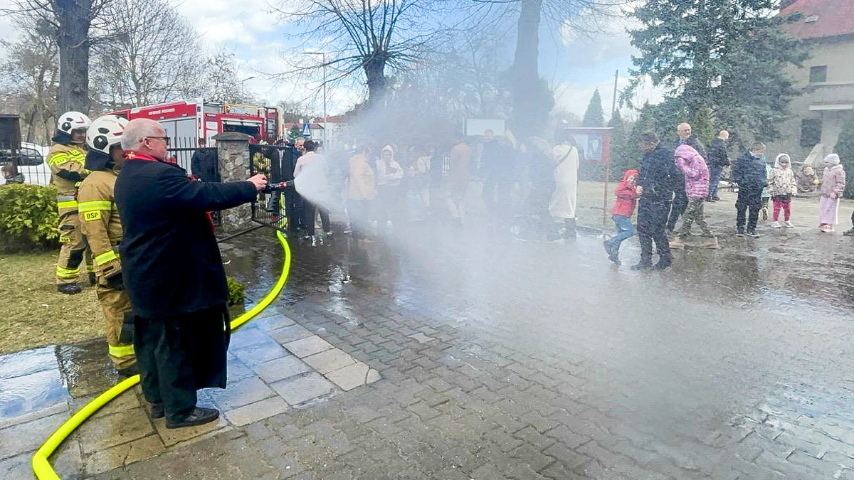 Proboszcz z fary nie był jedynym, który dziś wziął w ręce strażacką prądnicę. O solidny, tradycyjny śmigus-dyngus zadbała także ks. Waldemar Wenta, proboszcz parafii pw. Chrystusa Króla w Świeciu. Jego wsparli niezawodni druhowie OSP Przechowo.
