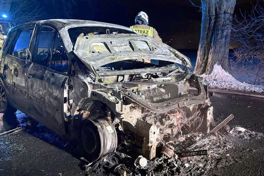 - Jak ustalono, kierowca i pasażer opuścili auto jeszcze przed przyjazdem służb. Na szczęście nikt nie odniósł obrażeń i nie było konieczności udzielania pomocy medycznej – informuje Ochotnicza Straż Pożarna w Łowinku.