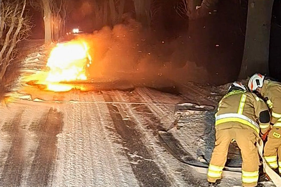 Po przybyciu na miejsce strażacy zastali pojazd objęty silnie rozwiniętym pożarem.