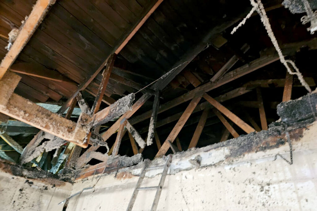 Ogień objął konstrukcję dachu, poddasze i izolację termiczną sufitu podwieszanego. Strażacy nie dopuścili do rozprzestrzenienia się pożaru na resztę budynku. Działania trwały około 2,5 godziny.