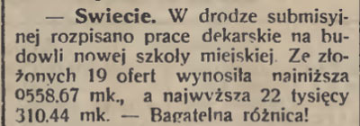 Na łamach gazety „Ostdeutsche Presse” z 16 kwietnia 1916 r. czytamy: Świecie, 14 kwietnia. (Odmowa odbioru.) Wczoraj miał się odbyć odbiór ławek szkolnych dostarczonych przez spółdzielnie stolarskie "Grudziądzko - Kwidzyńską" i "Toruńską" do naszej nowej szkoły podstawowej. Ponieważ jednak prace nie zostały wykonane w całości zgodnie z umową, komisja budowlana odmówiła odbioru. Nowa szkoła podstawowa ma zostać oddana do użytku natychmiast po feriach wielkanocnych.