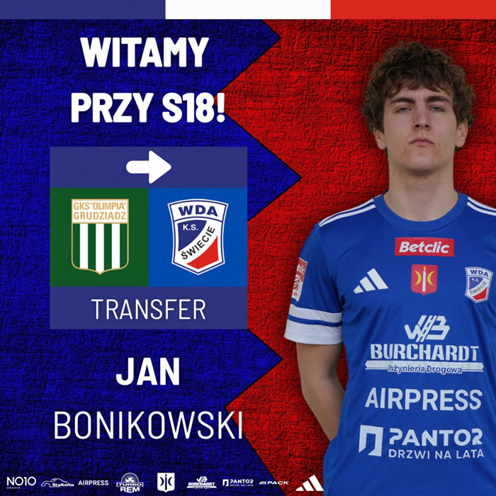 Mimo to Wda nie próżnuje na rynku transferowym. Klub ogłosił właśnie pozyskanie z Olimpii Grudziądz Jana Bonikowskiego. To napastnik, który może grać także na skrzydle, a w swoim CV ma choćby występy w akademii KGHM Zagłębia Lubin.