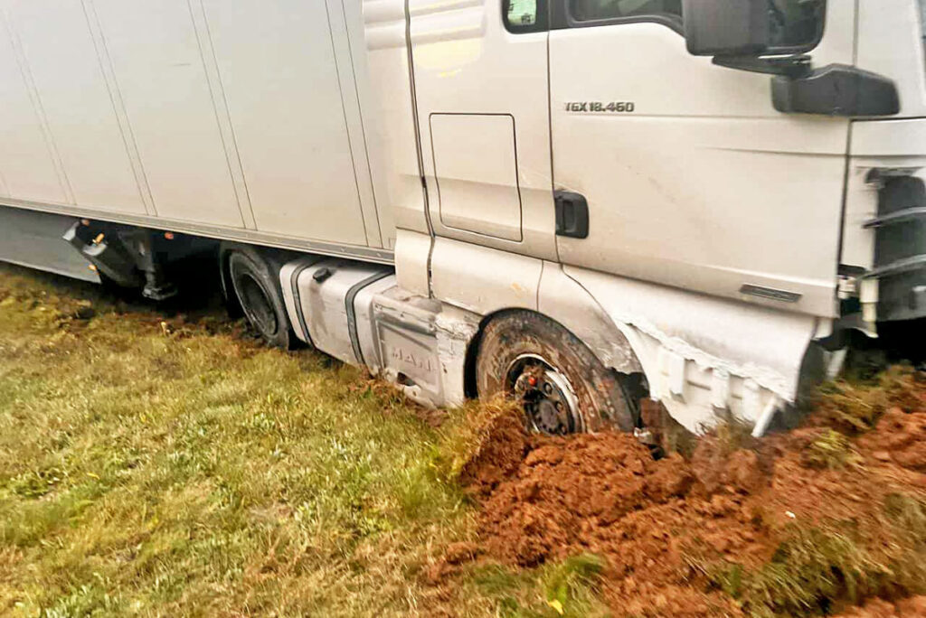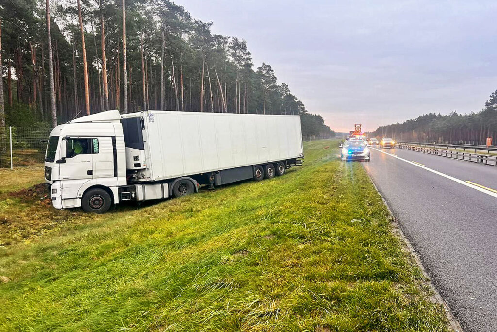 Na autostradzie A1 między węzłami Grudziądz-Warlubie ciężarówka zjechała z trasy i przód pojazdu "wbił się" w ziemię.