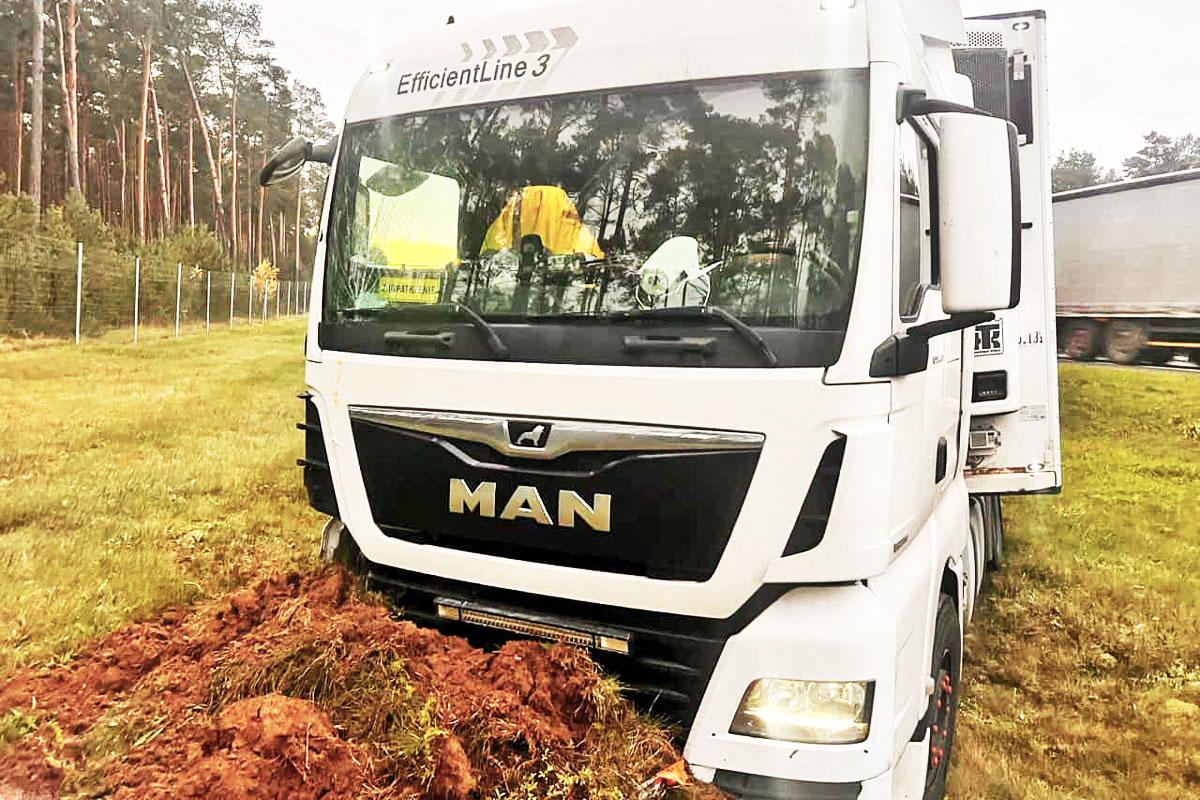 Na autostradzie A1 między węzłami Grudziądz-Warlubie ciężarówka zjechała z trasy i przód pojazdu "wbił się" w ziemię.