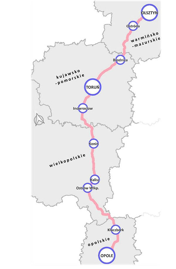 Planowany korytarz transportowy poลฤ czyลby Olsztyn, Toruล i Opole oraz m.in. Inowrocลaw, Konin, Kalisz i Ostrรณw Wielkopolski tworzฤ c nowฤ krajowฤ oล komunikacyjnฤ w ukลadzie pรณลnoc-poลudnie.