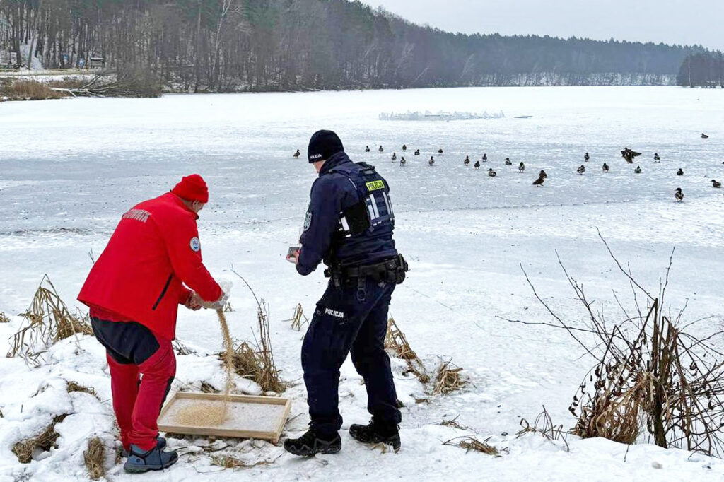 Mundurowi w trakcie służby zadbali również o zwierzęta. Dokarmiali ptactwo wodne, które z uwagi na warunki pogodowe ma ograniczony dostęp do pokarmu.