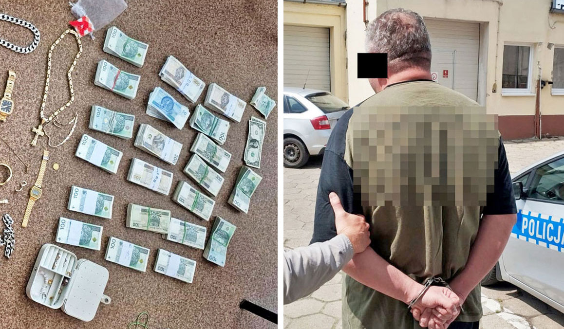 Jacek S. podczas zatrzymania. Policja zabezpieczyła znalezione u niego 250 tys. zł / Fot. KPP w Świeciu