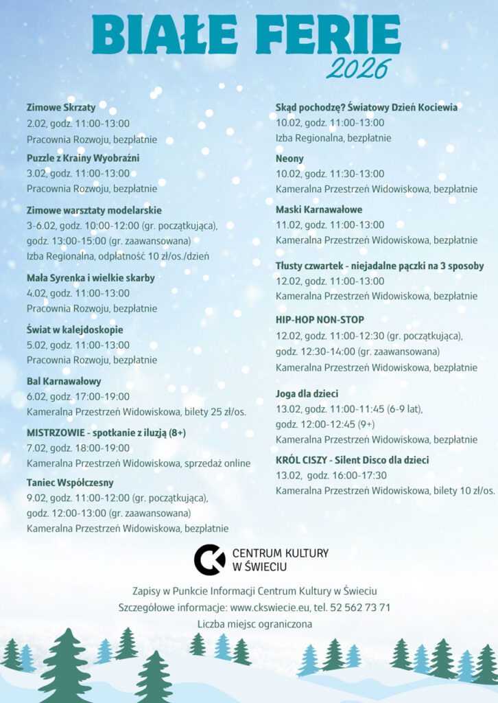 Jak co roku animatorzy Centrum Kultury w Świeciu przygotowali propozycje na aktywne spędzenie ferii zimowych.