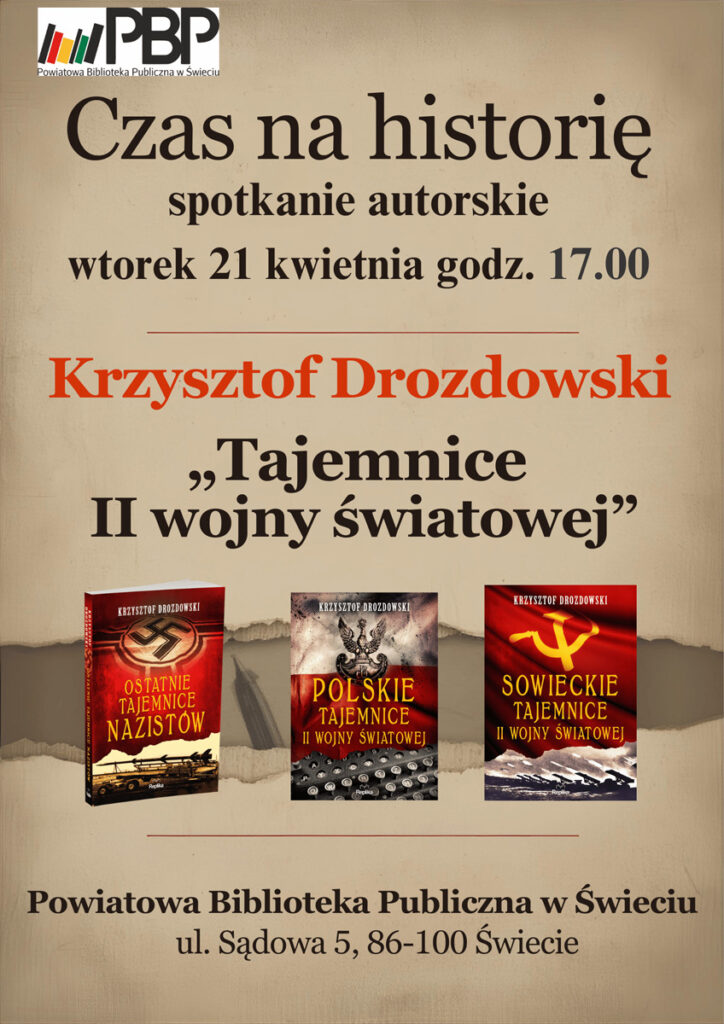 "Czas na historię", spotkanie autorskie z Krzysztofem Drozdowskim, wtorek 21 kwietnia, godz. 17.00, Powiatowa Biblioteka Publiczna w Świeciu, ul. Sądowa 5.
